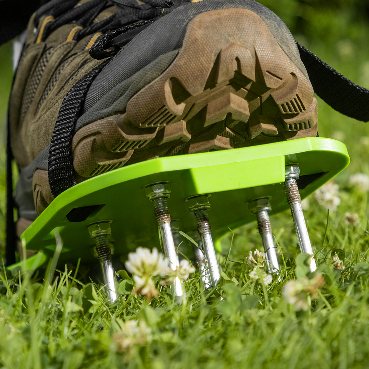 - Удобное использование — аэратор выполнен в форме платформ для ног с длинными стержнями, достаточно надеть их и походить по участку.