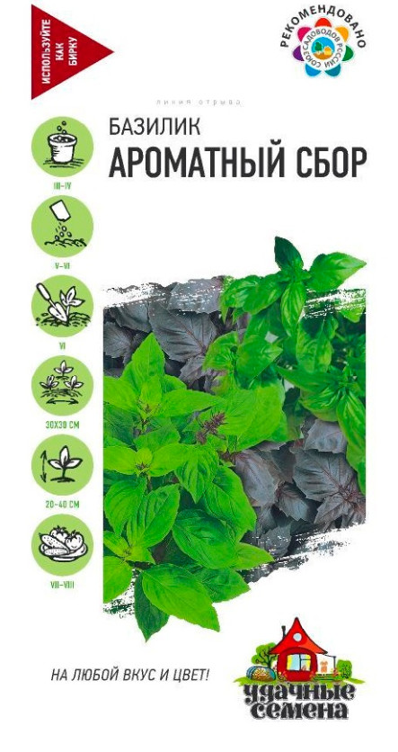 Смесь из раннеспелых урожайных сортов фиолетового и зеленого базилика. Растения высотой 20-40 см. Листья крупные, разнообразной формы, ароматные, с приятным вкусом содержат много витаминов и минеральных веществ. Используют в качестве салатной зелени, приправы к мясным и рыбным блюдам. Базилик обладает тонизирующими свойствами, улучшает пищеварение. Выращивают рассадным способом или прямым посевом в открытый грунт. Посев на рассаду производят в конце марта-начале апреля. Посев в грунт-в мае или начале июня. Высадка рассады в грунт-в начале июня. Схема посадки: 30х30 см. Предпочитает хорошо структурированные, богатые гумусом почвы. Нуждается в регулярных поливах.