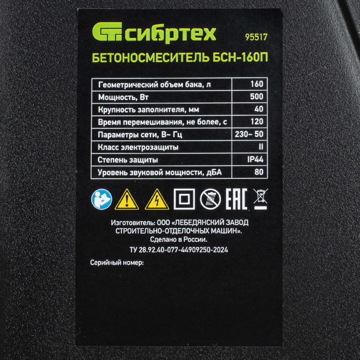 Бетоносмеситель БСН-160П, мощность 500 Вт, полиамидный венец Сибртех
