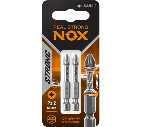 Торсионная бита NOX STRONG – профессиональная бита c повышенным ресурсом и износостойкостью. Предназначена для использования с электроинструментом в ударном режиме.Тип шлица PH2, длина 25 мм.Изготовлены из легированной стали марки S2, обладающей повышенной прочностью и износостойкостью за счёт пружинных свойств. Твёрдость стали по шкале Роквелла 58-62 HRC.Шестигранный хвостовик ¼ HEX исключает проскальзывание оснастки в патроне электроинструмента.Биты NOX изготовлены методом фрезеровки , что обеспечивает точность формы биты в соответствии со стандартом DIN и гарантирует высокий ресурс биты.Подходит для работы электродрелью со стандартным трёхкулачковым зажимным патроном и шуруповёртом с шестигранным патроном для быстрой смены насадки.