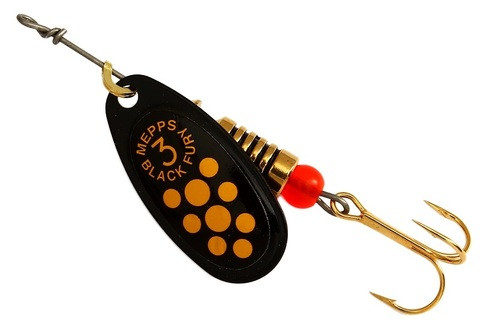 MEPPS предлагает COMET BLACK FURY, как одну из самых уловистых форелевых блесен. Тем не менее, по опыту российских рыболовов, эта разновидность COMET не только подходит для ловли большинства видов рыб, но и в целом ряде случаев не имеет себе равных. Дословно BLACK FURY переводится, как «черная бешеная» или «суматошная чернушка». Все разновидности оснащаются лепестками серебряного, золотого, медного и черного цветов. Между собой они различаются по окраске точек на черном фоне наклеек, расположенных с внешней стороны лепестков.При вращении лепестка, благодаря цветным точкам наклеек и ее черной подложке, приманка напоминает крупное насекомое. Поскольку блесны оснащаются лепестками различных цветов, то всегда есть возможность выбора наиболее удачного сочетания. В одном случае, предпочтительней окажется яркая окраска, контрастирующая с окружающим фоном, в другом — «покровительственная», т.е. маскирующая (такой вариант очень эффективен при охоте за осторожной рыбой). Иногда бывает, что к успеху приводит чисто механический подбор цвета приманки, поскольку нет никаких видимых оснований для конкретного выбора. Часто в информационном материале MEPPS обращает внимание рыболовов на сходство окраски вращающихся блесен и водных объектов, таких как насекомые и мелкие рыбешки. В отношении последних, у опытных рыболовов существуют обоснованные сомнения. Весьма приблизительной имитацией рыбки, из вращающихся блесен, может служить лишь AGLIA LONG. В основном, это достоинство воблеров и колеблющихся блесен. Дело в том, что не только мирные, но и хищные рыбы в раннем периоде своего развития проходят насекомоядную стадию. Естественно, что рефлекторная память сохраняется очень долго, этим, вероятно, и объясняются феноменальные способности COMET BLACK FURY.Эти расцветки - очень богатые украшения блесен, воссоздающие визуальные стимулы наиболее привычных жертв: сверчков, кузнечиков, лягушек, водных и земных личинок, гольянов в брачных окрасках.Угол вращения лепестка такой же как и у блесны COMET - 45°