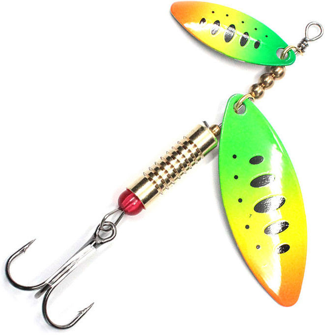 Блесна вращающаяся - это вертушка-тандем с двумя лепестками, что удваивает гидроакустический эффект и при проводке создает более сильные высокочастотные колебания, что приманивает любого хищника и делает ее более уловистей. Первый лепесток меньше второго, поэтому вихри, которые создаются за первым лепестком, не влияют на работу последнего лепестка. Лепестки имеют длинную и острую форму, которые прекрасно работают на течении и придонной ловле. Быстро замечают и атакуют такого рода приманки щука.
