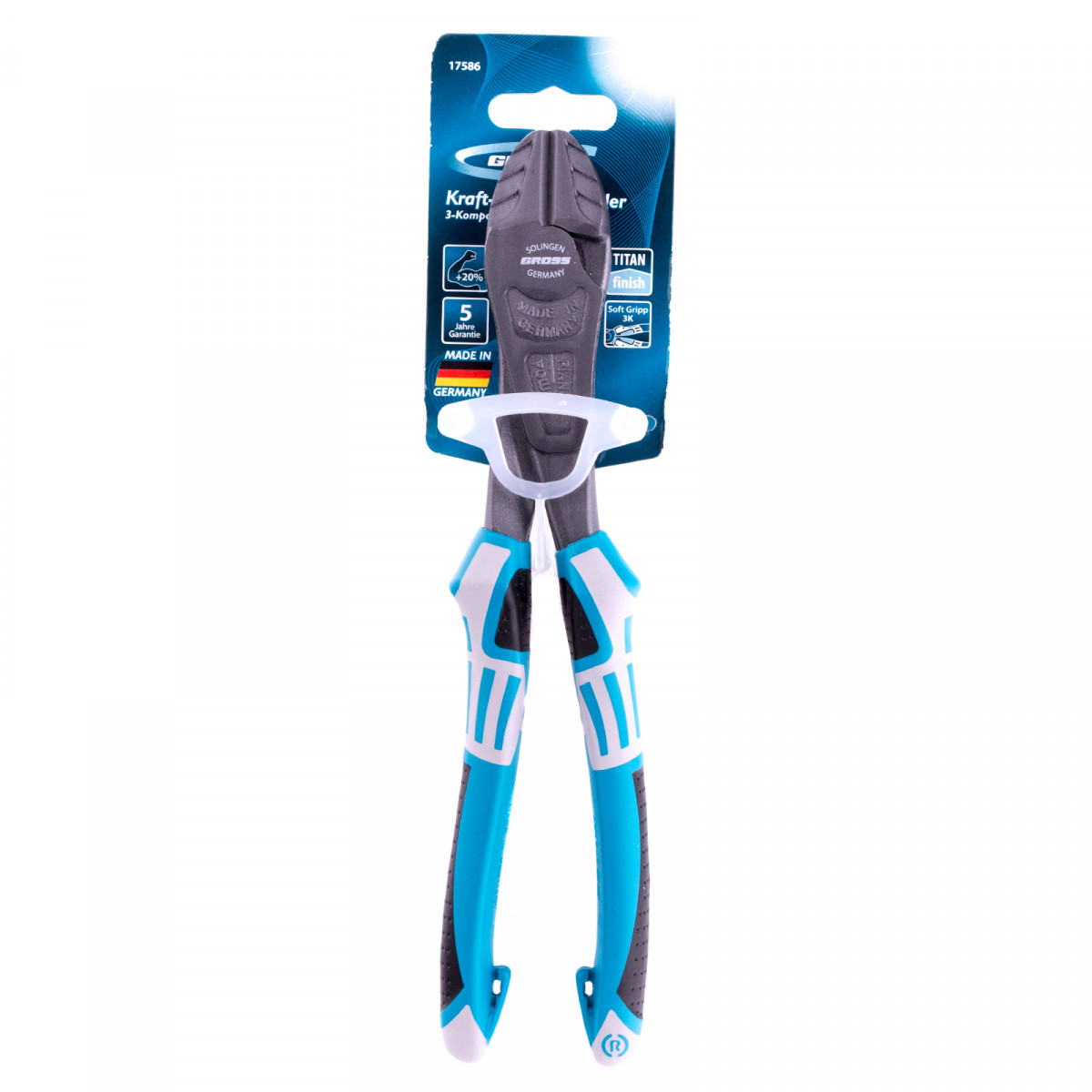 Усиленные бокорезы Gross 17586 длиной 240 мм, с трехкомпонентными рукоятками, предназначены для разрезания кабелей, проводов, проволоки, рояльных струн и т.д. Способны перекусывать не только алюминий, медь, пластмассу, но и более жесткие детали из стали диаметром до 4,5 мм. Встроенный рычажный механизм и смещенный непосредственно к режущим кромкам шарнир увеличивают усилие реза на 20%.