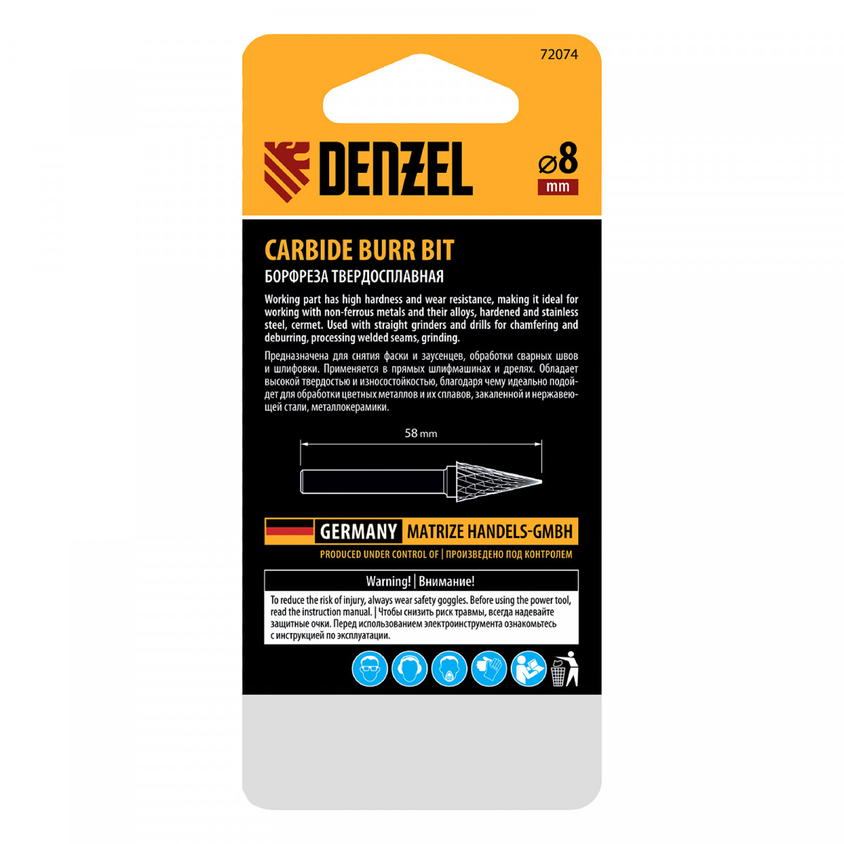 Борфреза по металлу твердосплавная, коническая, тип-M, 8 мм Denzel