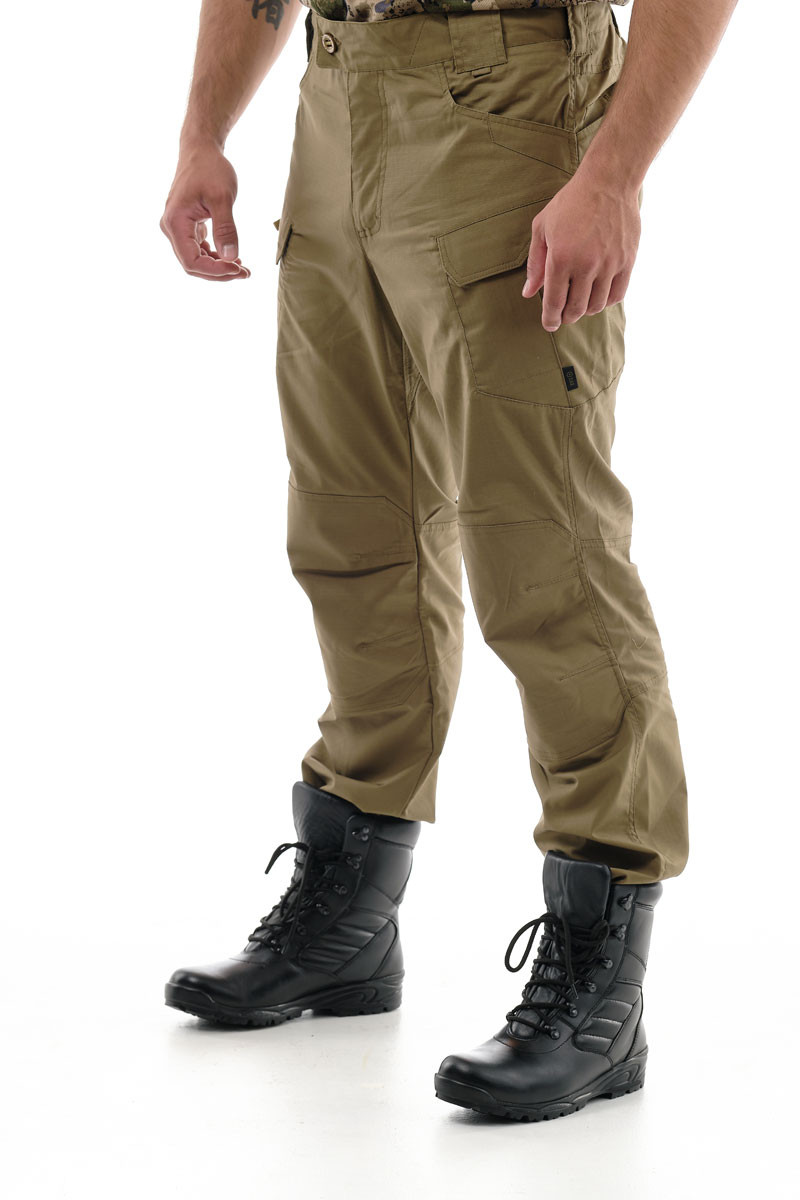 Брюки «Файтер» классического прямого кроя. Застежка на молнию и пуговицу. Пояс по спине собран на резинку, есть шлевки под ремень. Стрелка спереди застрочена. Карманы на бедрах и сзади объемные, застегиваются на листочку с липучкой.