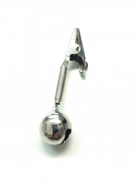 Простейший сигнализатор поклёвки - двойной бубенчик.. Крепится на кончик хлыста удилища с помощью металлического зажима, типа "крокодильчик".