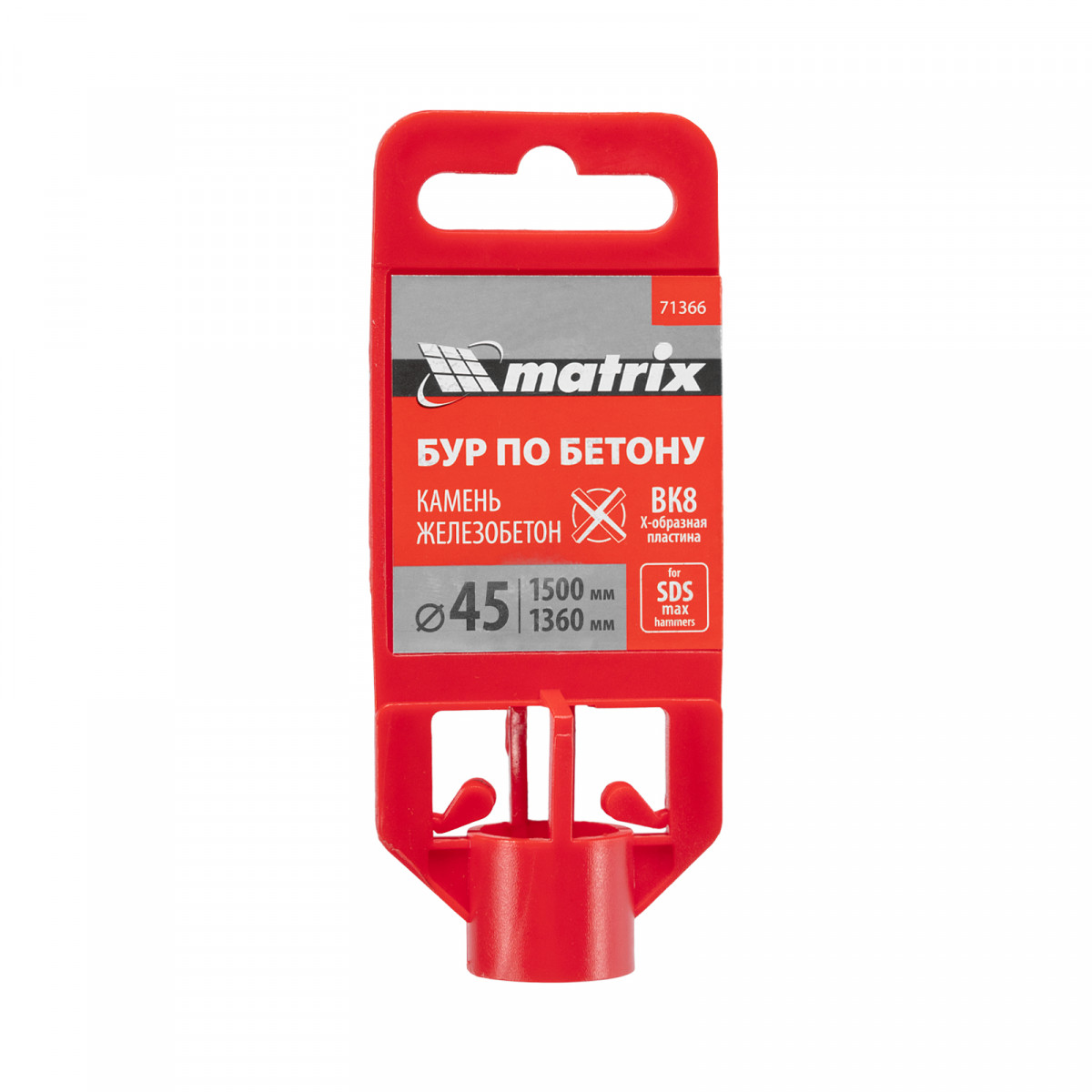 Бур по бетону Matrix 71366 длиной 1500 мм, с хвостовиком SDS MAX и крестовой пластиной, — оснастка для перфораторов высокой мощности, предназначенная для получения отверстий диаметром 45 мм в стенах, полах, перекрытиях. Крестовая пластина в сочетании с усиленной системой крепления SDS MAX позволяет успешно работать с камнем, кирпичом и бетоном, в том числе армированным. Бур используется во время проведения строительных работ, незаменим для прокладки коммуникаций: газо- и водопроводов, электросетей и т.д.
