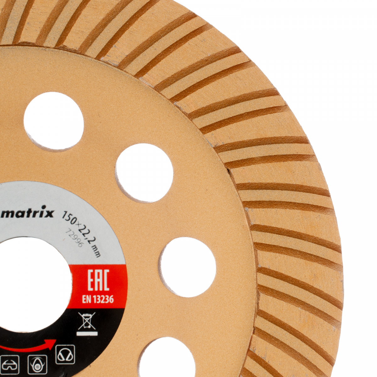 Алмазная зачистная чашка Matrix Turbo 72997 диаметром 150 мм устанавливается на вал углошлифовальной машины, для чего предусмотрено посадочное отверстие 22,2 мм. Используется для придания окончательной гладкости бетонным, каменным, мраморным, гранитным и кирпичным поверхностям, а также для снятия фаски на плитах из гранита или мрамора. Предназначена для профессионального применения.