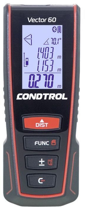 Лазерный дальномер Condtrol Vector 60 1-4-104 используется для измерения расстояния как в помещении, так и на улице. Пригодится строителям, монтажникам, отделочникам и домашним мастерам.Прибор обладает большим количеством функций: трекинг (непрерывное измерение), сложение/вычитание, вычисление площади и объема, вычисления по теореме Пифагора. Расстояние может измеряться с передней или задней стенки корпуса, со штатива, откидной скобы. Встроенная функция Bluetooth позволяет передавать результаты на смартфон или планшет.