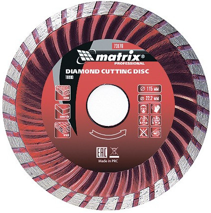 Волнообразная форма металлического основания является наиболее удачной и способствует максимально быстрому удалению продуктов пиления, улучшенному охлаждению и снижению нагрузки на УШМ. Диск используется при сухой резке бетона, железобетона, мрамора.