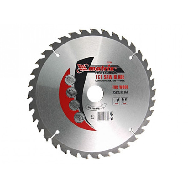 Диски MATRIX Professional предназначены для продольного и поперечного распила древесины. Корпус диска шлифованный, изготовлен из стали 65Г и термонормализован. Зубья из ВК8 припаяны высокопрочным припоем. Алмазная заточка с выхаживанием значительно увеличивает срок службы инструмента. Дополнительный боковой разворот передней поверхности зубьев позволяет производить более качественное и чистое пиление.