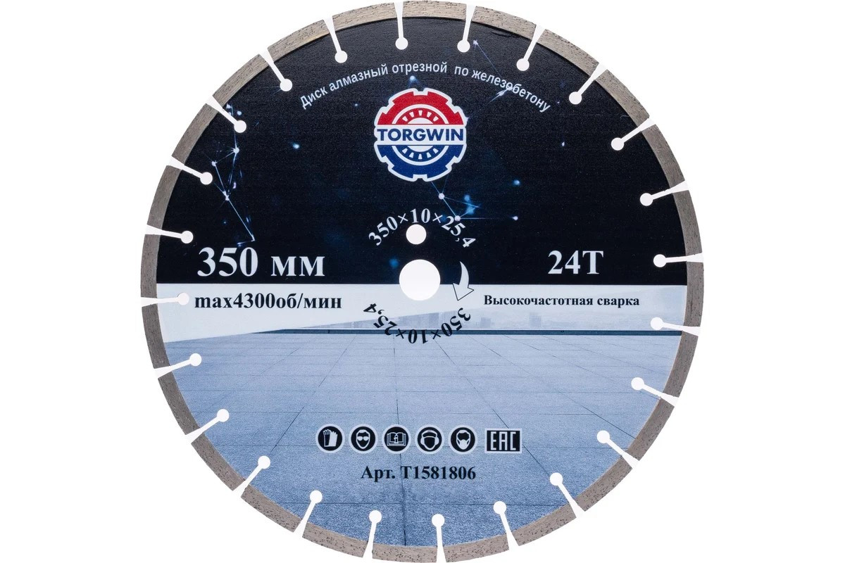 Диск алмазный отрезной сегментный TorgWin Диаметр: 350мм. Предназначен для сухого реза: бетона, армированного бетона, прессованного бетона, бетонных труб, твердого камня и различных строительных материалов.