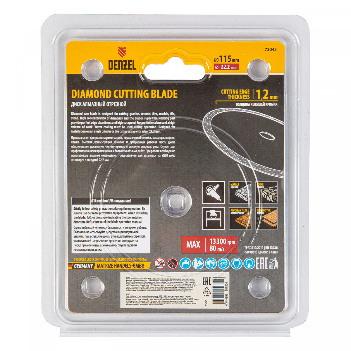 Диск алмазный отрезной 115 х 22,2 мм, сплошной, супертонкий, горячий пресс, мокрое резание Denzel