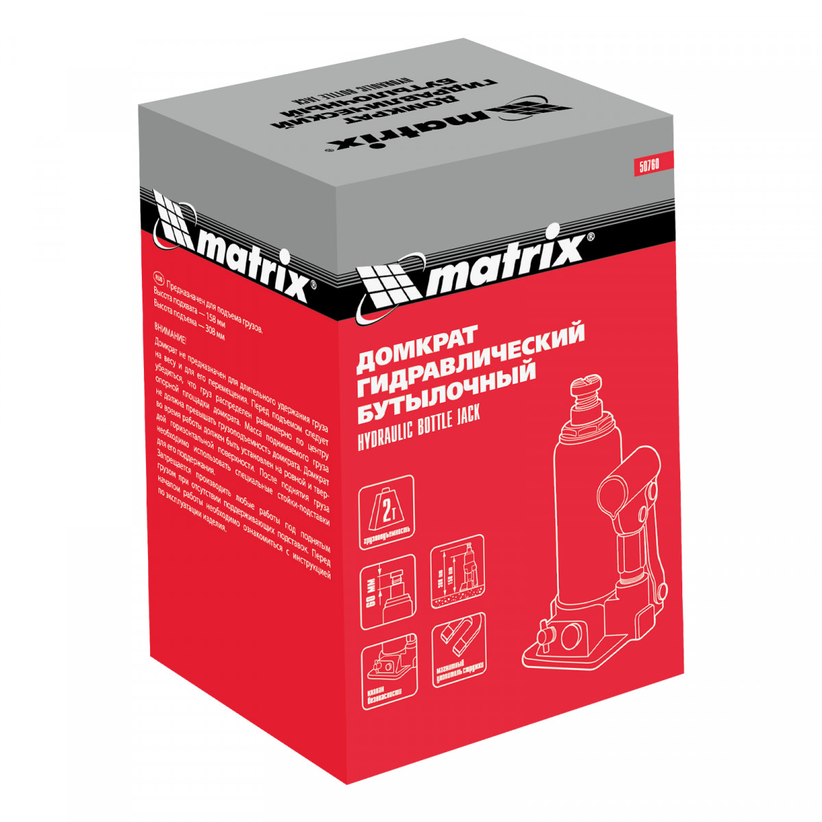 Домкрат гидравлический бутылочный, 2 т, h подъема 158-308 мм Matrix