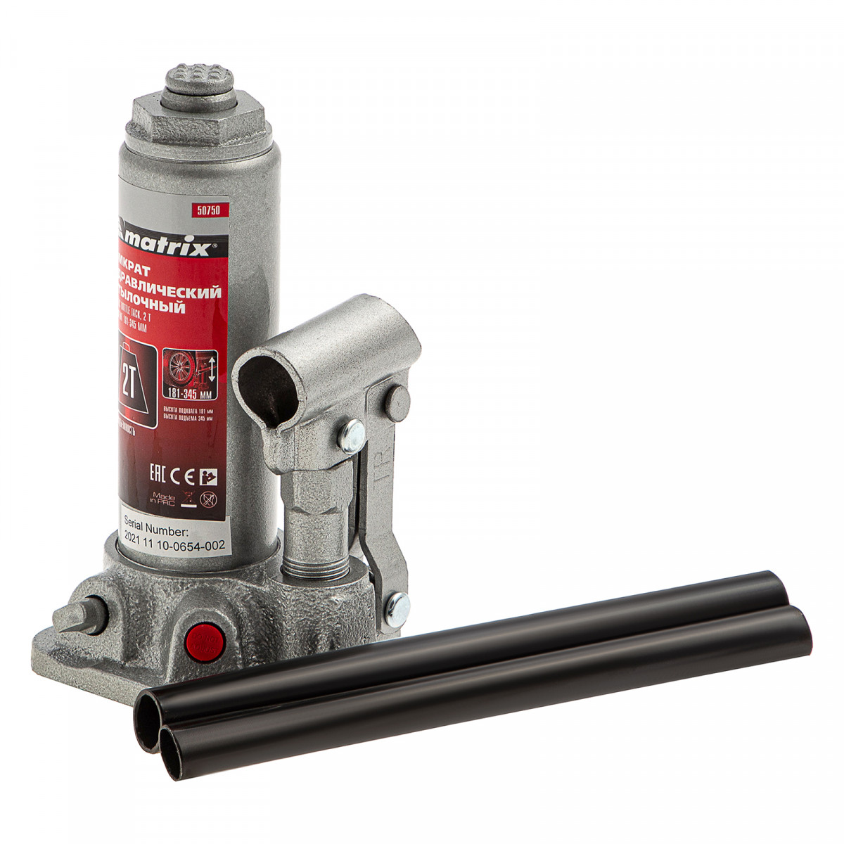 Домкрат гидравлический бутылочный Matrix 50750 предназначен для подъема грузов массой до 2 т на высоту от 181 до 345 мм. Оптимален для машин с большим клиренсом. Будет полезен автолюбителям при проведении технического обслуживания и ремонте авто в дороге или в гараже. Также домкрат подходит для полупрофессионального применения на станциях ТО.