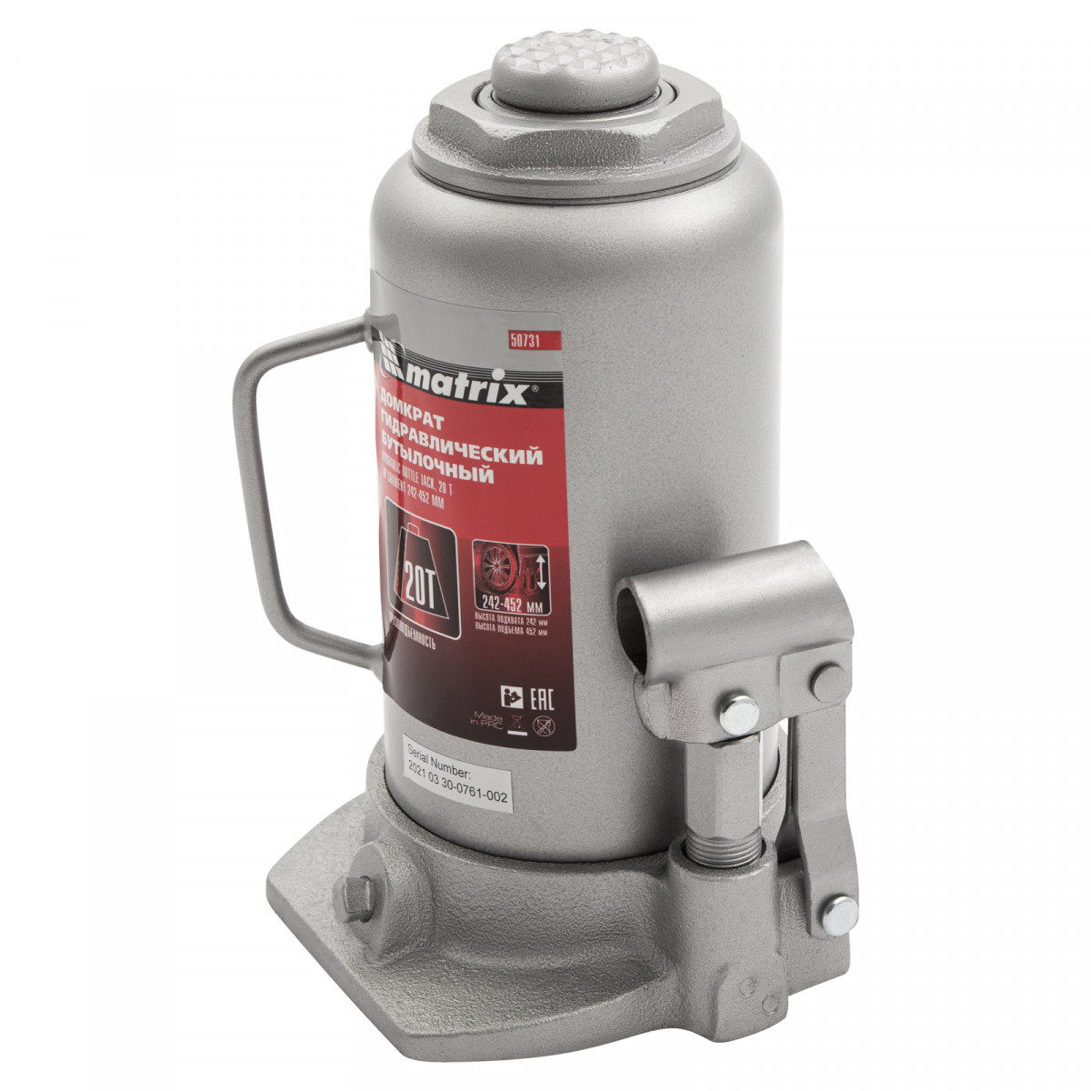 Домкрат гидравлический бутылочный, 20 т, высота подъема 242-452 мм Matrix
