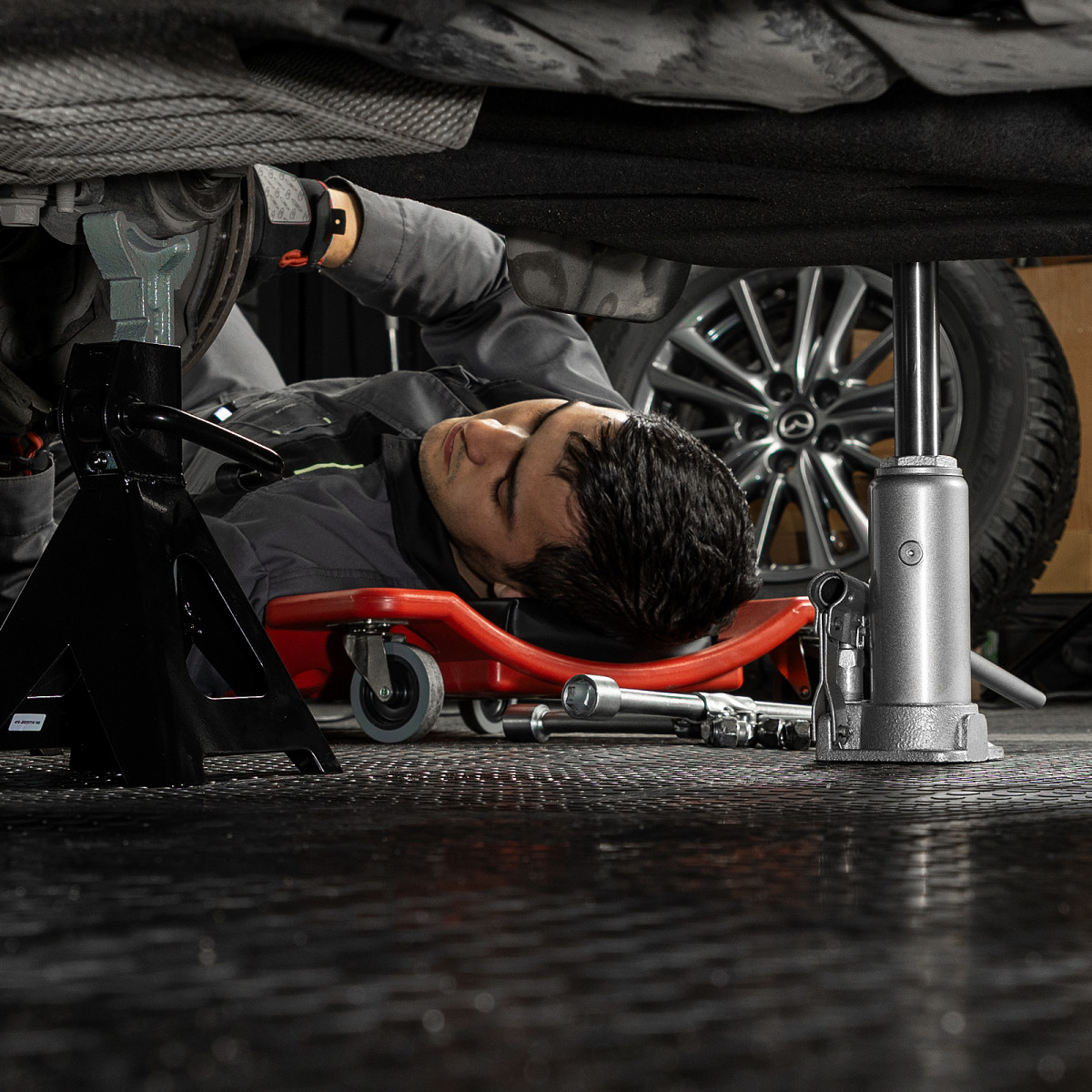 • Удобное хранение и транспортировка — домкрат поставляется в прочном пластиковом кейсе с ручкой.