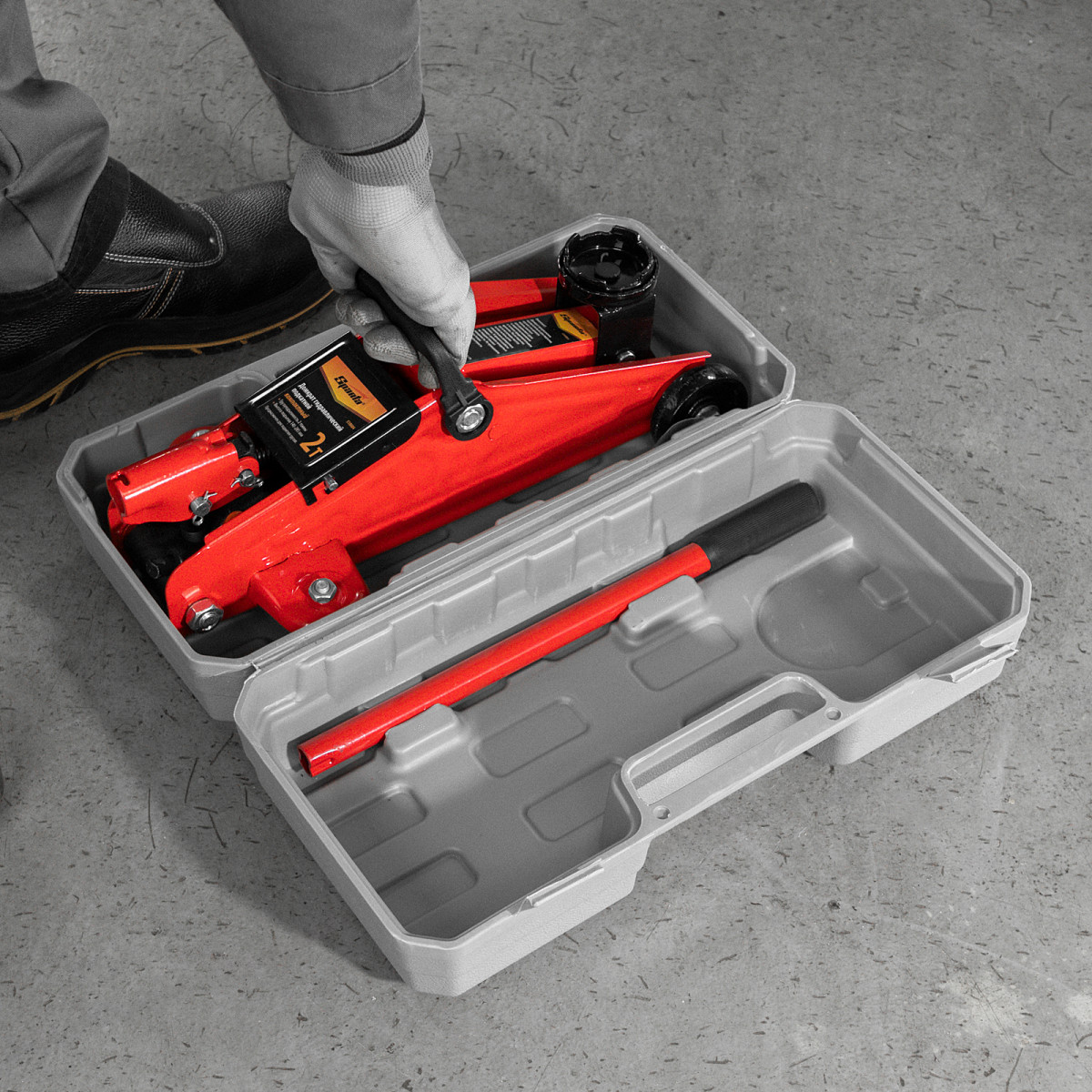 • Удобное хранение и транспортировка — домкрат поставляется в пластиковом кейсе.