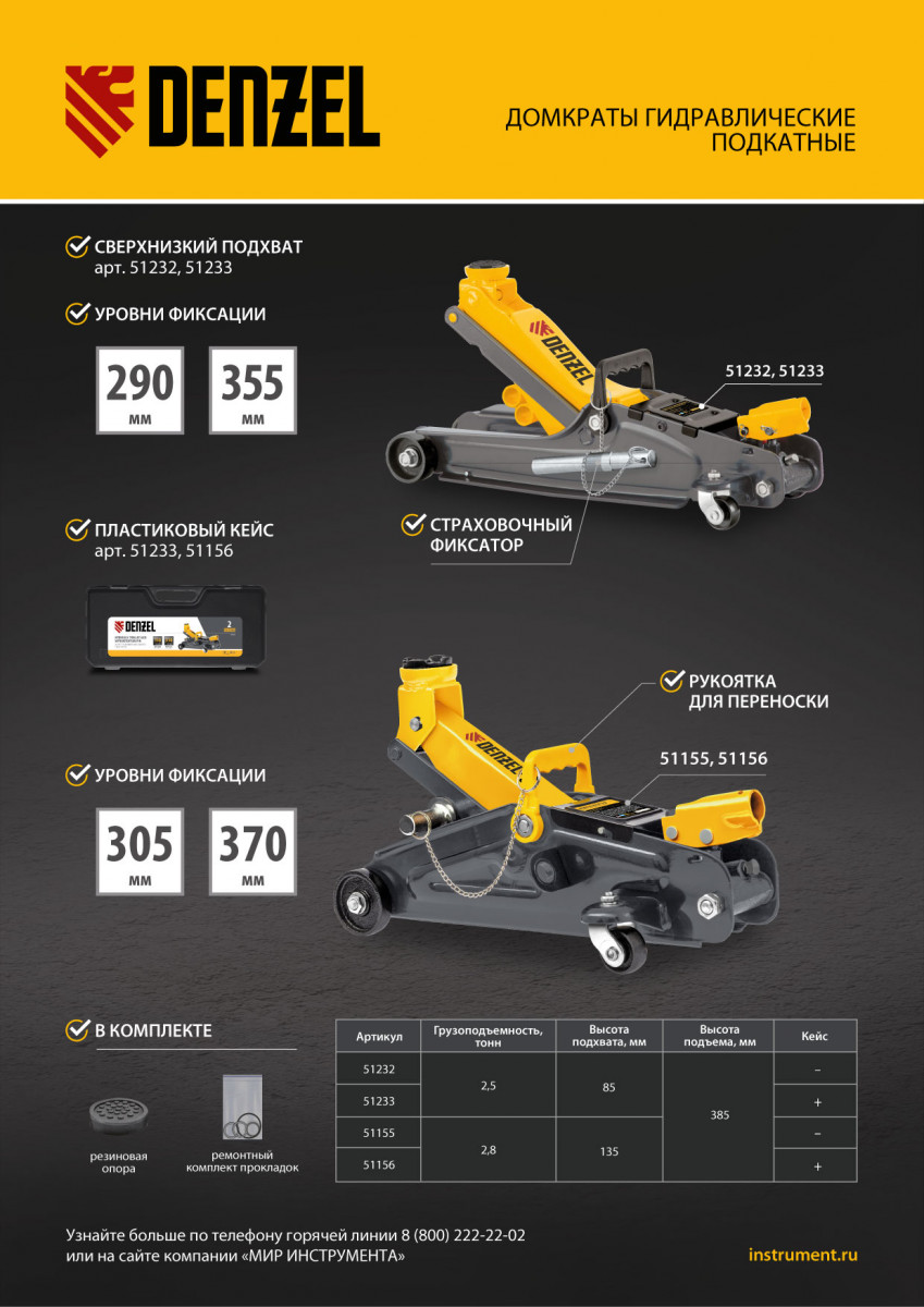 Гидравлический подкатной домкрат с фиксатором Denzel 51155 с высотой подхвата 135 мм предназначен для плавного подъема грузов массой до 2,8 т на высоту до 385 мм. Страховочный штифт позволяет фиксировать подъемный рычаг на высоте 305 и 370 мм для безопасной работы. Домкрат пригодится владельцам легковых автомобилей со стандартным клиренсом.