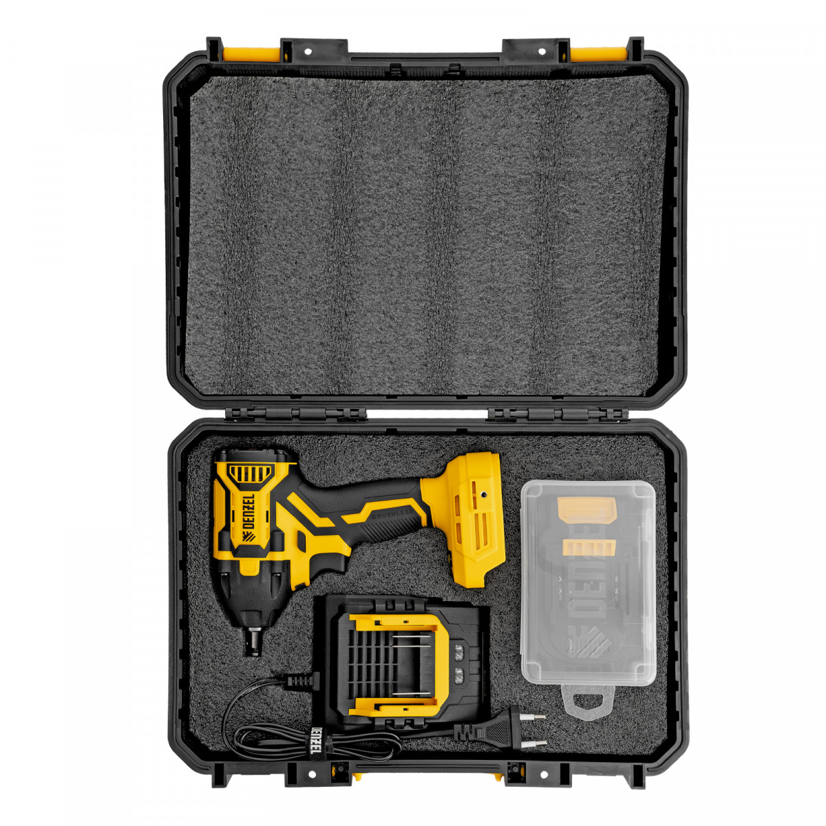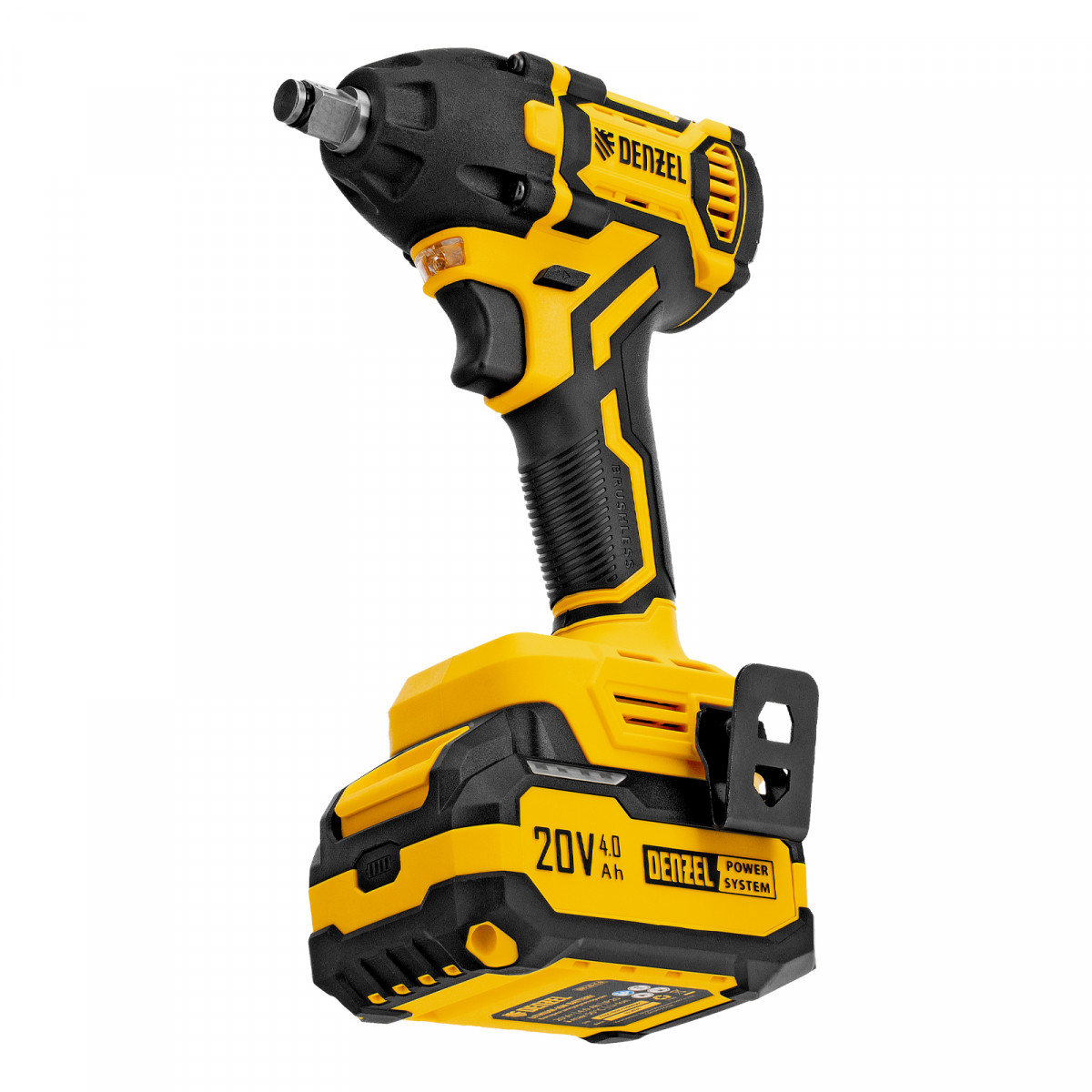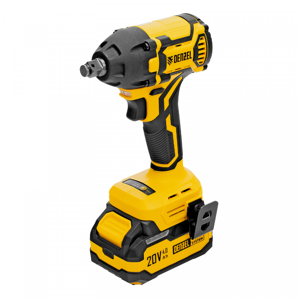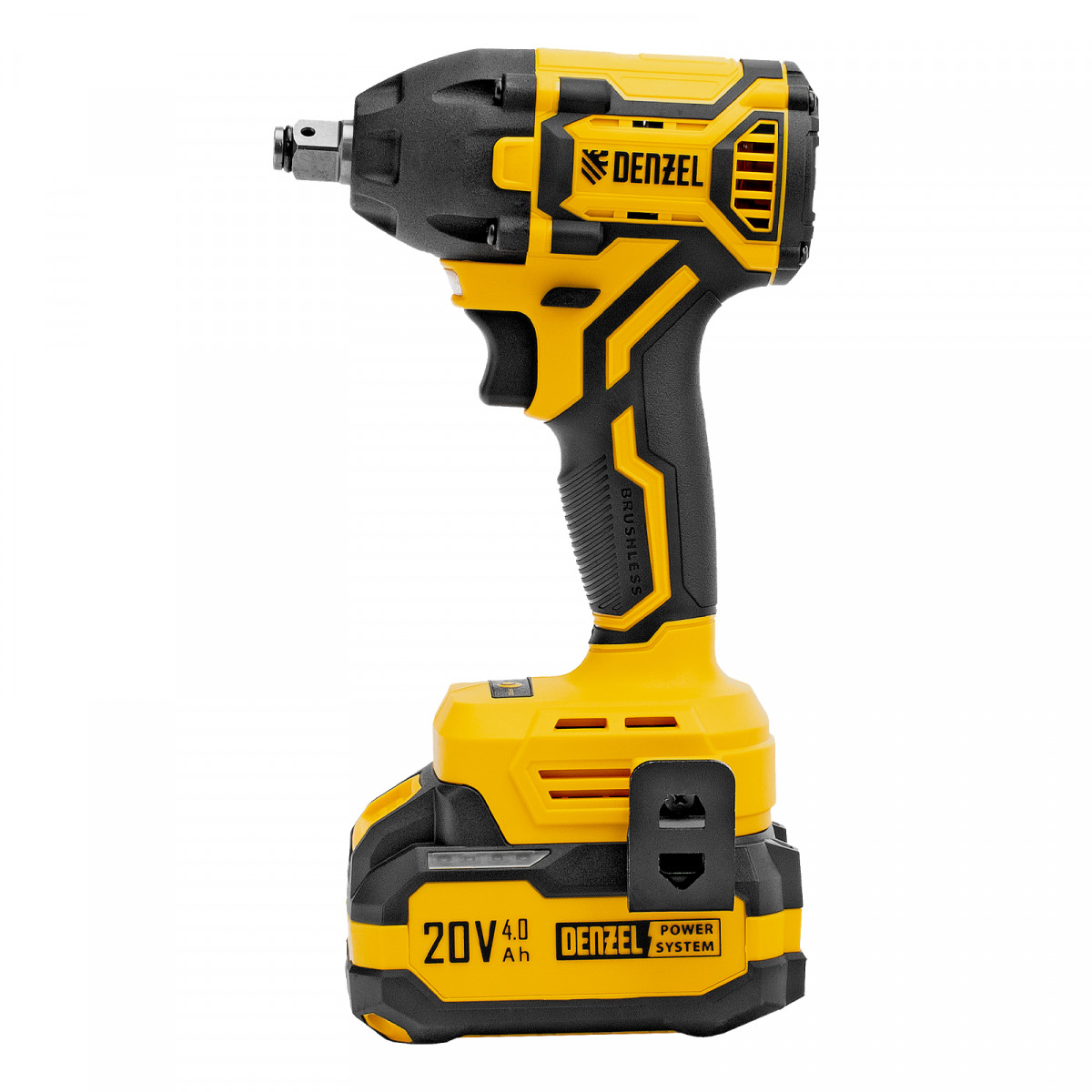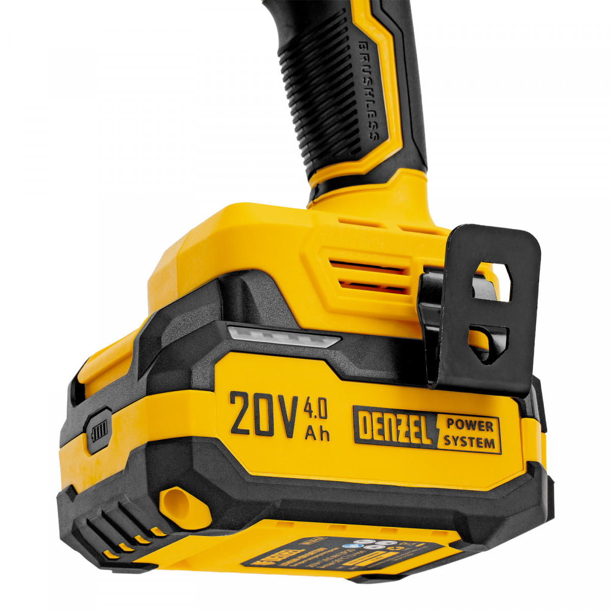 - Универсальность — аккумулятор Li-Ion емкостью 4 А·ч совместим со всеми инструментами единой платформы Denzel Power System 20V.