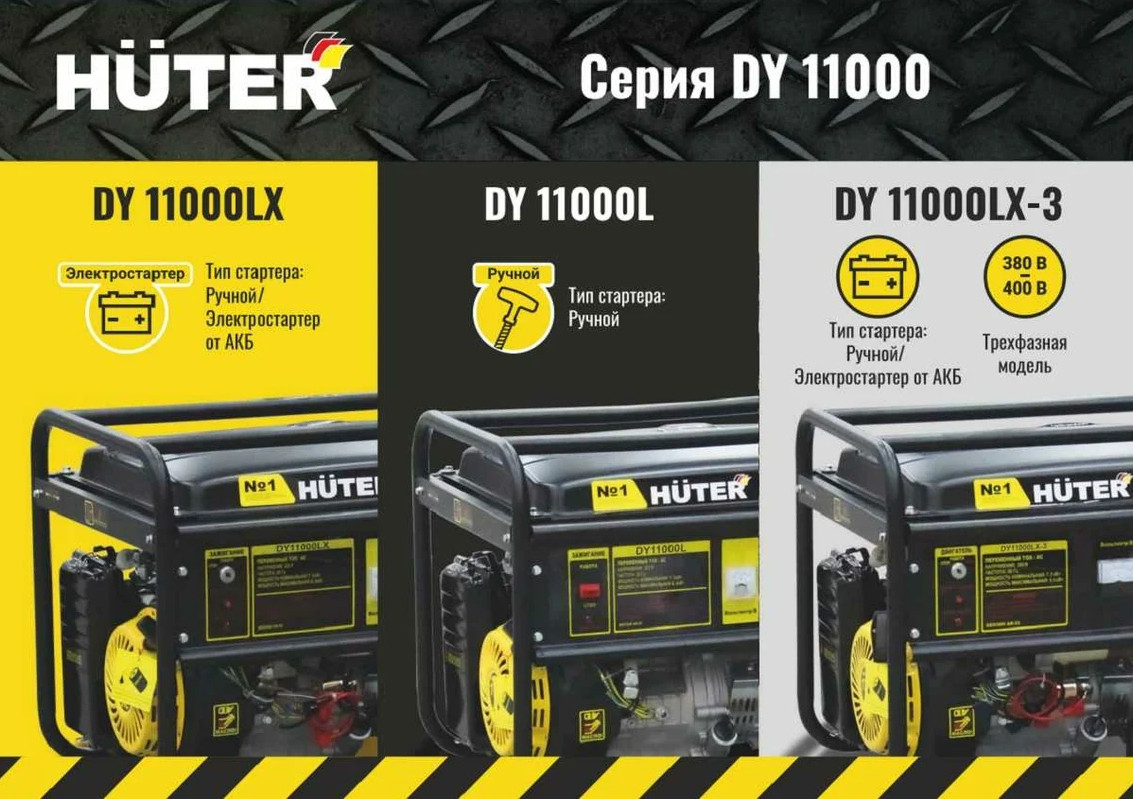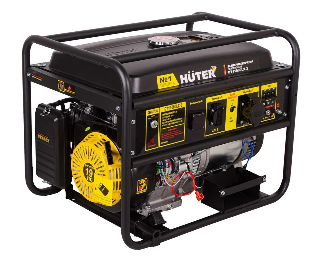 • Бензиновая электростанция Huter DY11000LX-3 оборудована мощным одноцилиндровым четырёхтактным двигателем внутреннего сгорания, мощностью 19 лс