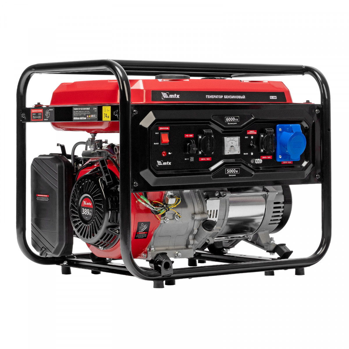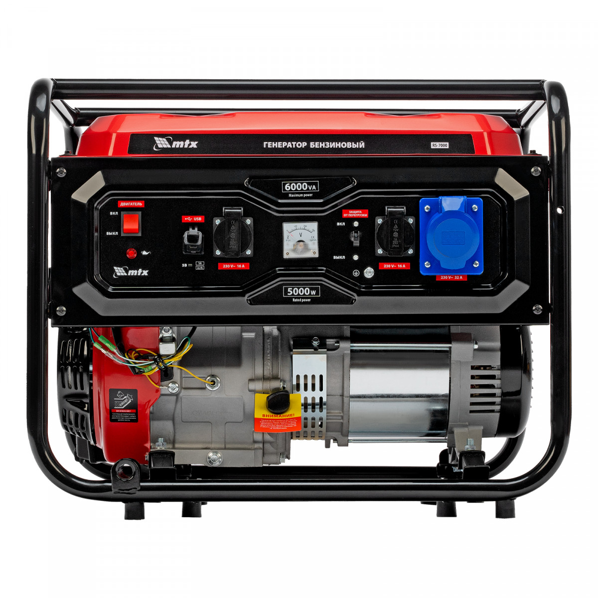 Бензиновый генератор MTX RS-7000 946135 максимальной мощностью 6 кВт, с ручным стартером, поддерживает напряжение 230 В и обеспечивает функционирование бытовой техники, электроинструмента, осветительных приборов и других потребителей в случае отсутствия электросети или перебоев в ее работе. Стабилизатор напряжения AVR защищает чувствительные приборы от поломки. Для подключения потребителей служат 2 розетки 230 В/16 А, для питания мощной техники предназначена силовая розетка 230 В/32 А. На панели управления также предусмотрен выход постоянного тока USB/TYPE-C 5 В, позволяющий заряжать смартфоны, планшеты и другие гаджеты. Генератор пригодится владельцам загородных участков.