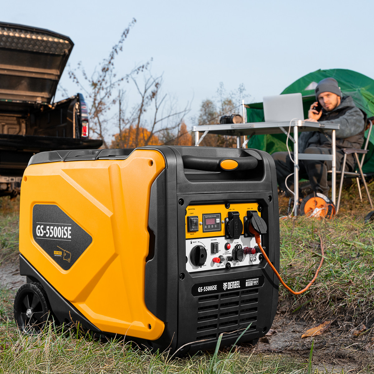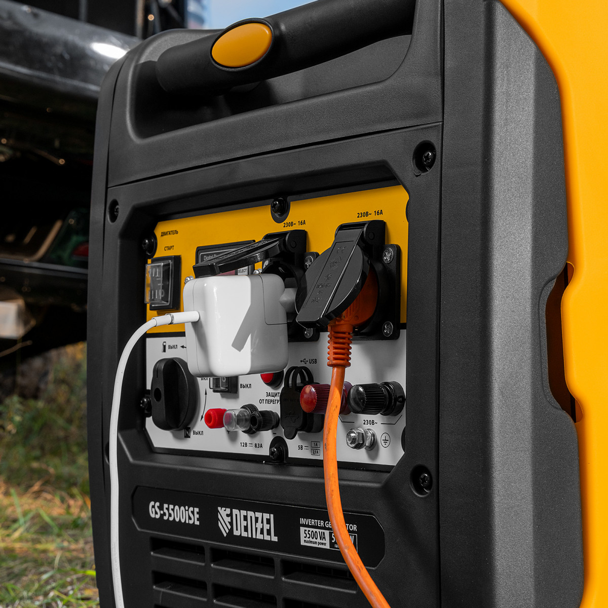 Генератор инверторный Denzel GS-5500iSE 94712 максимальной мощностью 5,5 кВт, в закрытом корпусе, с электростартером, поддерживает напряжение в сети 230 В и используется для обеспечения работоспособности бытовой техники, электроинструмента и осветительных приборов в условиях отсутствия бытовой сети. Для подключения потребителей предусмотрено две розетки 230 В / 16 А. Выход USB 5 В позволяет подключать мобильное устройство, например, смартфон или планшет, а клеммы постоянного тока 12 В служат для зарядки автомобильных аккумуляторов. Предусмотрена возможность снятия полной мощности одним потребителем: на панели управления имеются силовые клеммы. Генератор незаменим в загородном доме.