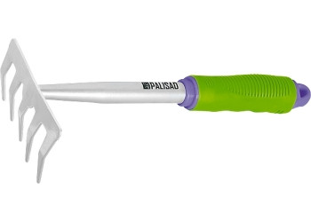 Грабли 5-зубые с обрезиненной рукояткой, которую при необходимости можно удлинить. Ширина рабочей части 110 мм, общая длина 280 мм. Предназначены для сбора срезанных побегов, рыхления и выравнивания почвы на небольших грядках и клумбах. Рабочая часть выполнена из инструментальной стали У8 и окрашена порошковой эмалью для предохранения от коррозии. Рукоятка выполнена из обрезиненного пластика, в торце рукоятки имеется винтовая заглушка, выкрутив которую можно удлинить инструмент на 500 мм при помощи штанги 63016 и на 800 мм при помощи штанги 63017. По окончании работы необходимо очистить рабочую часть инструмента от остатков грунта.