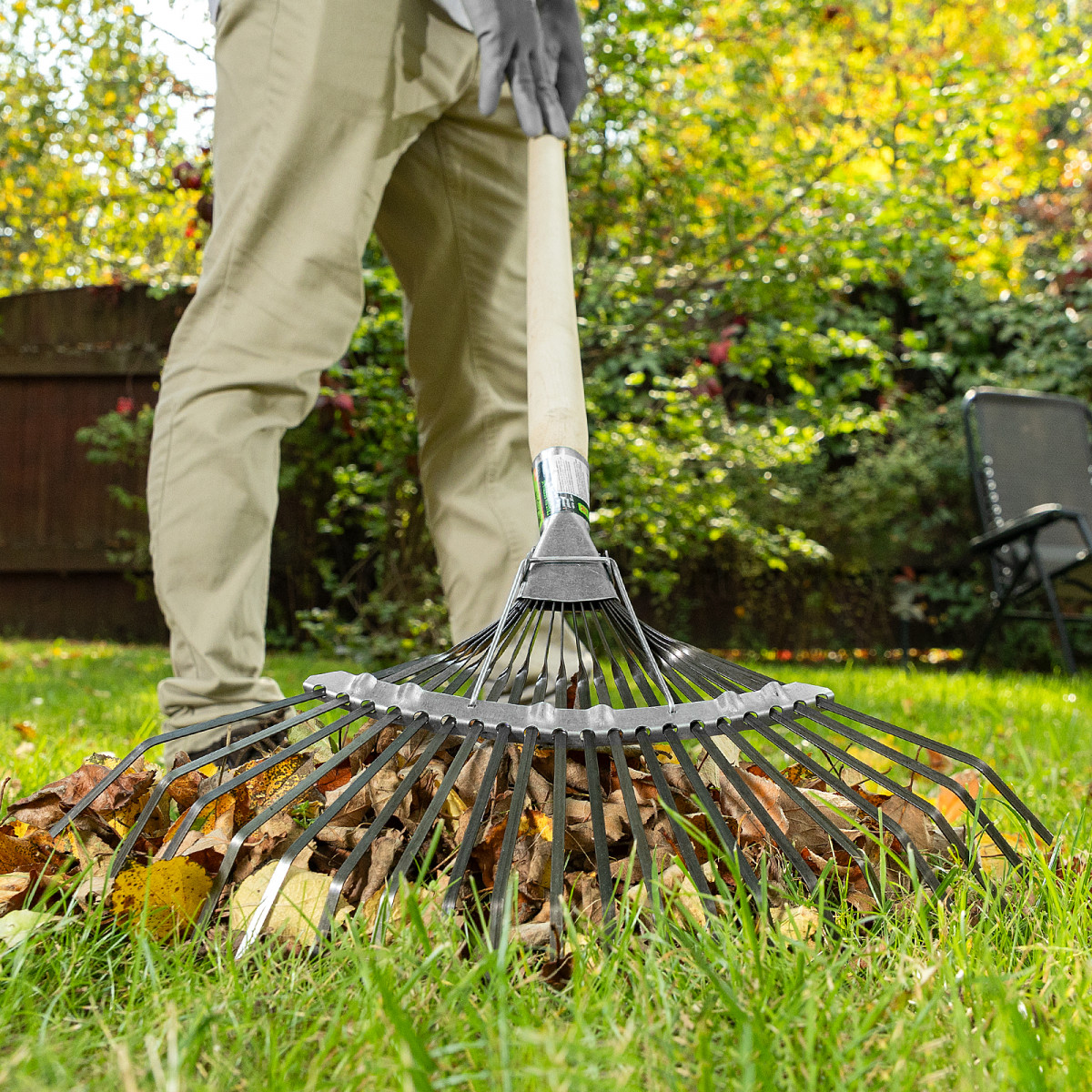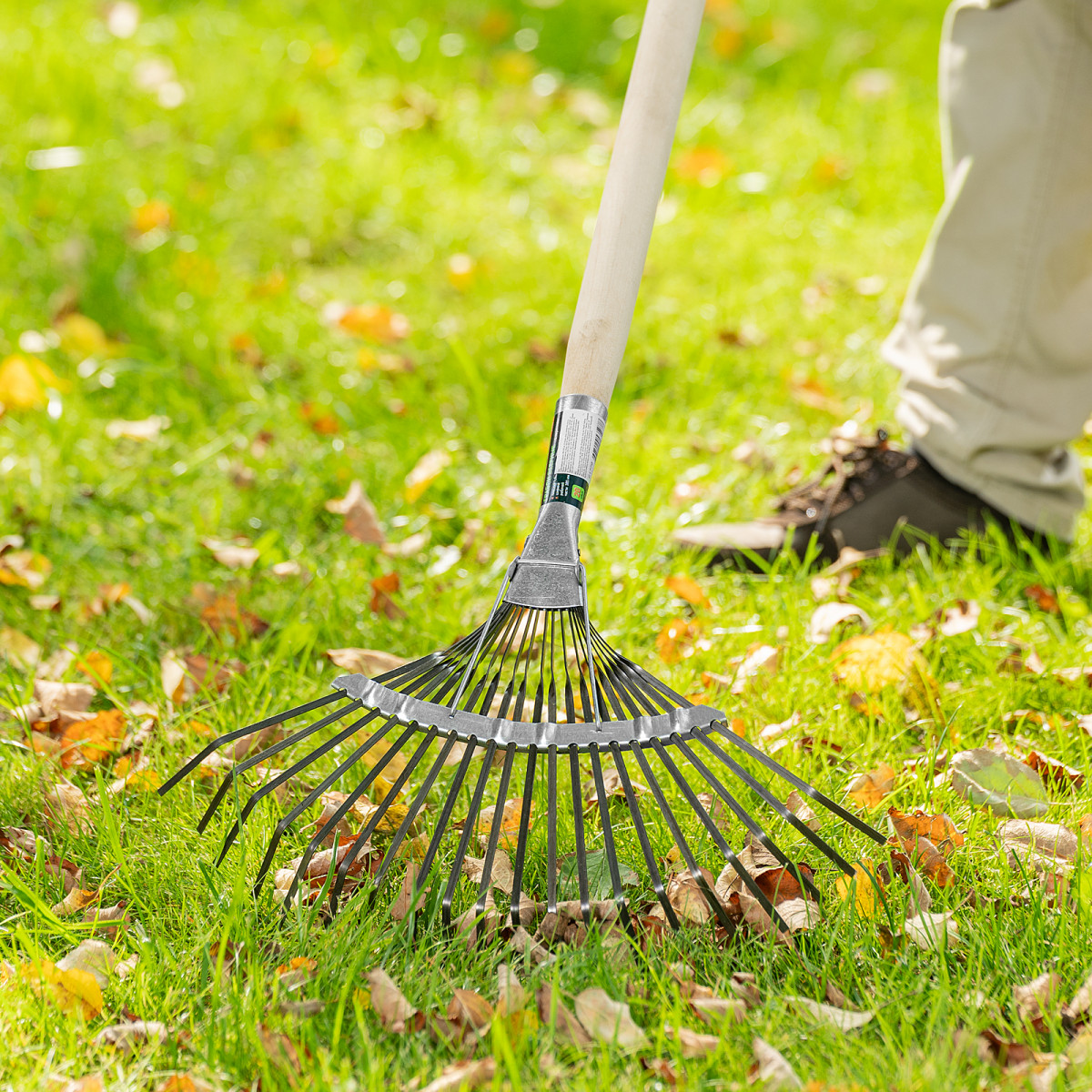 Веерные стальные грабли Сибртех 61779 размером 385 х 1500 мм, с 20 плоскими зубьями и деревянным черенком, предназначены для работы на садовом участке. Позволяют убирать мусор, листву и ветки с лужаек и грядок. Грабли поставляются в сборе с черенком и полностью готовы к эксплуатации.