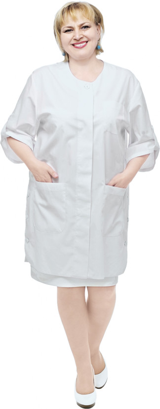 Халат: - укороченная модель; - прямой силуэт; - потайная застёжка на петли и пуговицы; - накладные карманы; - круглая горловина; - застёжка по низу в боковых швах на петли и пуговицы; - длина рукава регулируется патой на пуговице. Цвет: белый Ткань: «Тиси» Состав: 65% п/э, 35% х/б, пл. 120 г/м