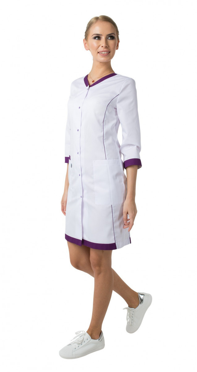 Женский медицинский халат белого цвета с фиолетовыми вставками. Интересная и не скучная модель. Удобные и вместительные карманы. Застежка на кнопках из нержавеющей стали, произведенными в Греции. Изделие выполнено из хорошей, качественной ткани средней плотности, содержащей 50% хлопковых и 50% полиэфирных волокон.