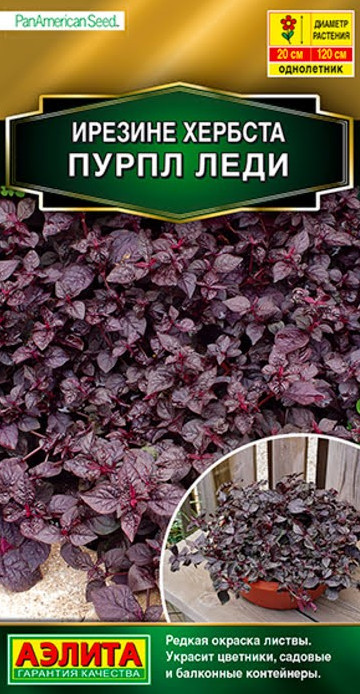 Впечатляющее декоративно-лиственное и почвопокровное растение от компании PanAmerican Seed (США). Обладает достаточно редкой пурпурно-фиолетовой окраской. Кустики распростертые, быстро формируют пышный низкий ковер высотой 20 см и шириной до 120 см. Прекрасно оттеняют яркую зелень других растений и заполняют пространства между ними. Используются на переднем плане цветников, в садовых вазах и подвесных корзинах, где побеги свешиваются, образуя красивые каскады. Раньше ирезине размножали исключительно черенками, но теперь появилась возможность легко вырастить ее из семян. Также это растение можно выращивать в помещениях как комнатный многолетник.