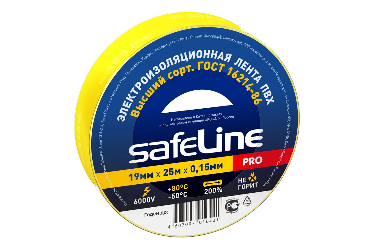 Изоляционная лента Safeline разработана и изготовлена на основе пленки из поливинилхлоридного изоляционного пластиката, используемой в производстве профессиональных изоляционных лент. Специальные добавки, входящие в состав данного материала, повышают эластичные свойства ленты, увеличивают ее долговечность и обеспечивают устойчивость к горению. – Ширина 19мм, длина 25м, толщина 0,15мм – Адгезия (липкость) - 45сек – Прочность при растяжении – 15МПа – Напряжение пробоя – 6000В – Максимальное удлинение - 200% – Температура эксплуатации от -50 до +80оС – Устойчива к горению – Соответствует ГОСТ, высший сорт