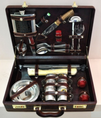 Внутренняя отделка кейса – кож.зам.Фляга – 1 шт. 16унц.Нож складной – 1 шт.Зажигалка – 1 шт.Нож туристический – 1 шт.Топор – 1 шт. нержавеющая сталь.Рюмки – 6 шт. нержавеющая сталь.Вилки – 6 шт.Ложки – 6 шт.Шампура – 6 шт.Таганок – 1 шт.Тарелки – 6 шт.Фонарик – 1 шт.Половник – 1 ш.Вилка салатная – 1шт.Солонки – 2шт.Кружки – 6 шт.
