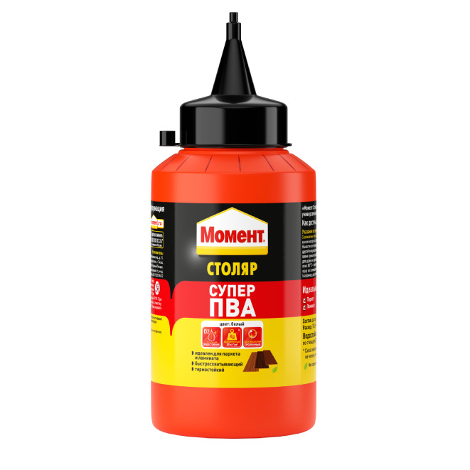 Быстросхватывающий термостойкий высокопрочный клей для всех пород дерева, ДСП, ДВМ, МТФ, фанеры, шпона, ламината, картона, фурнитуры, ткани, кожи, некоторых пластиков. Момент Столяр Супер ПВА рекомендуется для монтажного склеивания ламинированных и паркетных напольных покрытий. Прозрачный после высыхания.