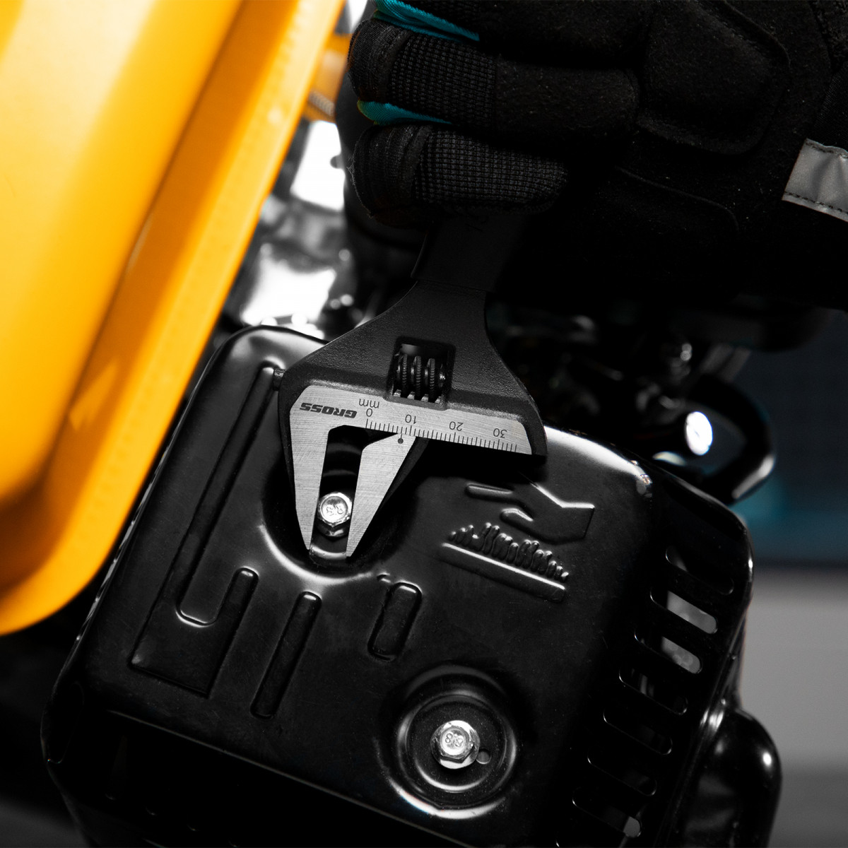 Разводной ключ Gross 15567 из стали CrV, длиной 150 мм, с тонкими губками и защитными насадками, обеспечивает ширину раскрытия губок на 30% больше, чем у стандартных моделей. Инструмент подходит для монтажа и демонтажа крепежных элементов диаметром до 35 мм. Применяется для сантехнических работ, ремонта автомобилей, решения бытовых задач. Тонкие губки легко проникают в труднодоступные места, а также удобны для захвата мелких деталей.