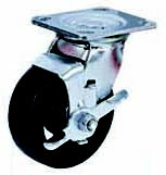 Колесные опоры большегрузные поворотные с тормозом, литая черная резина, чугунный обод, платформенное крепление, роликоподшипник.