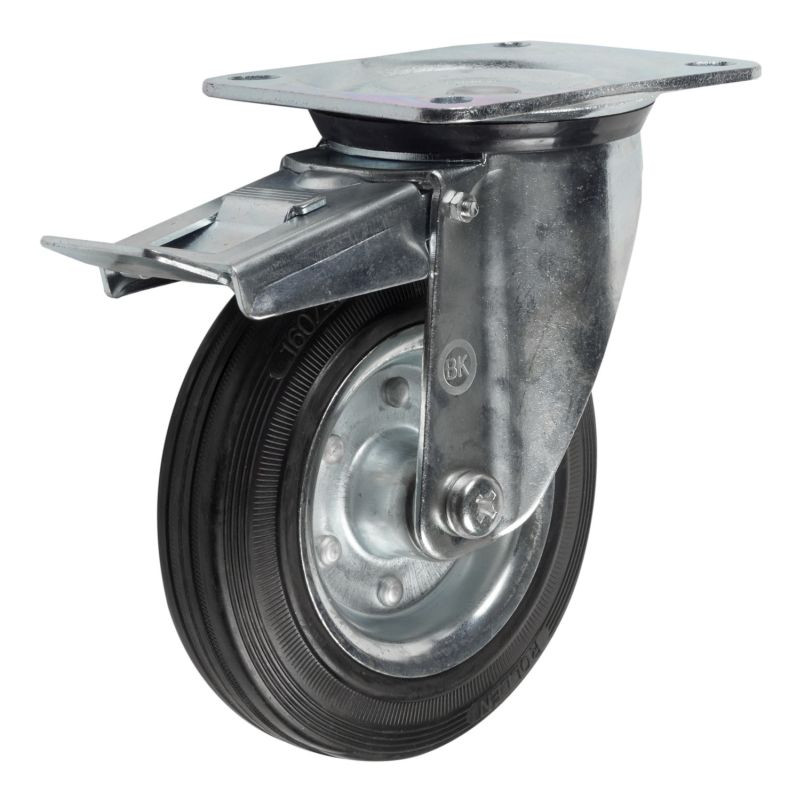 Колесные опоры промышленные усиленные поворотные с тормозом с платформенным креплением.Шинка — полуэластичная черная резина, обод из прессованной листовой стали, заклепан. В оси колеса роликовый подшипник.Поворотный узел с 2-х рядным шарикоподшипником. Толщина металла кронштейна для диаметров колес 160 и 200 мм - 4,5 мм.Стальной тормоз фиксирует поворот колеса и поворотный узел. Подходят для платформенных тележек, мусорных контейнеров, баков и т.д.Рабочая температура от -25°С до +50°С.