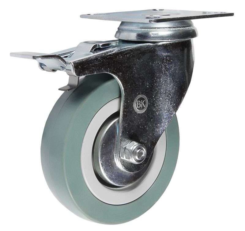 Аппаратная колесная опора поворотная с тормозом SCgb относится к легкой серии колес. Ободная часть аппаратной колесной опоры с тормозом изготовляется из серого полипропилена с двумя боковыми пыльниками, защищающими осевой механизм от повреждения посторонними веществами и пылью.Главной особенностью аппаратных колесных опор с тормозом серии SCgb является термоэластичный контактный слой, не наделяющий следами любые поверхности пола.Благодаря отмеченным особенностям шинки, аппаратные колесные опоры с тормозом SCgb применяются для аппаратуры, бытовой и офисной мебели, для медицинской техники и оборудования, металлической мебели, стеллажей, на тележки-"шпильки"для пищевых производств, для гостиничного оборудования и химчисток.В основе поворотного механизма аппаратной колесной опоры опоры находится двухрядный шариковый подшипник. В оси колесной опоры с тормозом аппаратного типа SCgb применена втулка скольжения.Аппаратные колесные опоры с тормозом обладают типовым креплением: крепление с помощью опорной площадки четырьмя болтами. В качестве тормозного механизма выступают педали из пластика, стопорящие аппаратные колесные опоры в повороте.Термические условия эксплуатации аппаратных колесных опор находятся в рамках от - 20°С до +50°С. Максимальная грузоподъемность – 27 кг.
