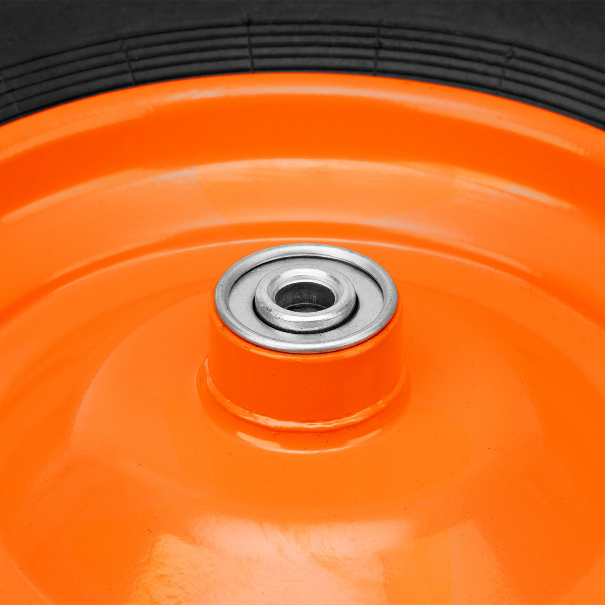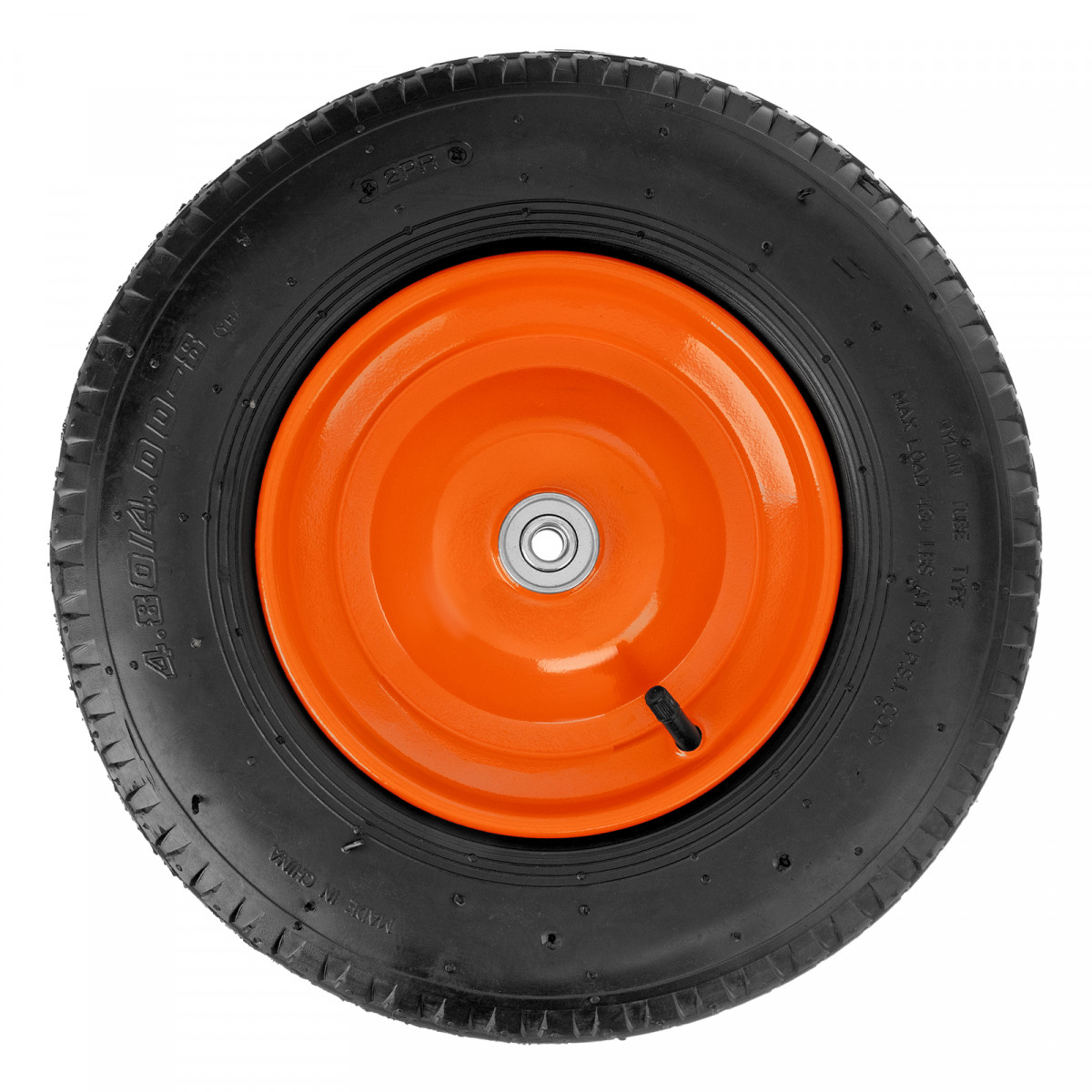 - Комфортная работа — пневматическое колесо эффективно поглощает вибрации даже при полной загрузке тачки.
