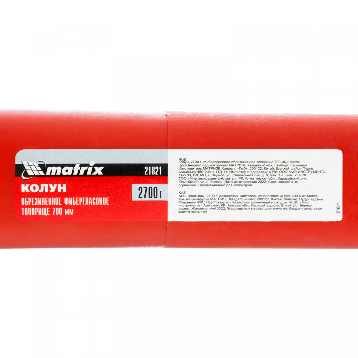 Колун Matrix 21821 с полотном массой 2700 г и фибергласовым обрезиненным топорищем длиной 700 мм предназначен для колки крупных дров. С тыльной стороны рабочей части имеется небольшой боек, который можно использовать вместо кувалды.
