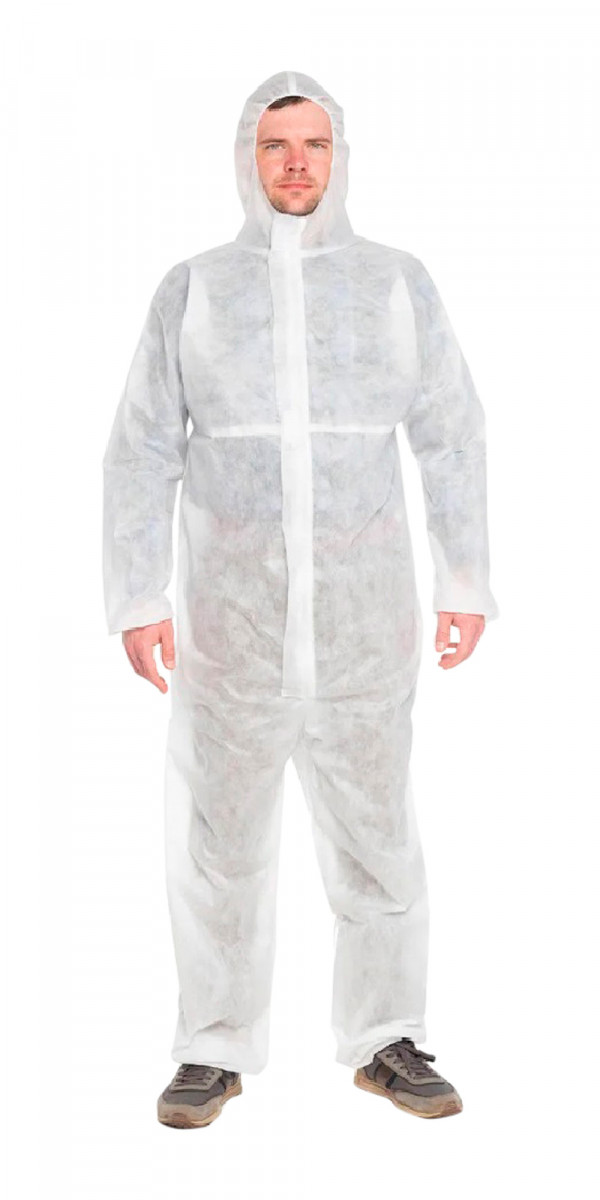 Одноразовый комбинезон белого цвета изготовлен из гипоаллергенного нетканого материала спанбонд плотностью 60гр/м.кв.Защита от твердых переносимых по воздуху веществ, тип защиты 5 (EN 13982).