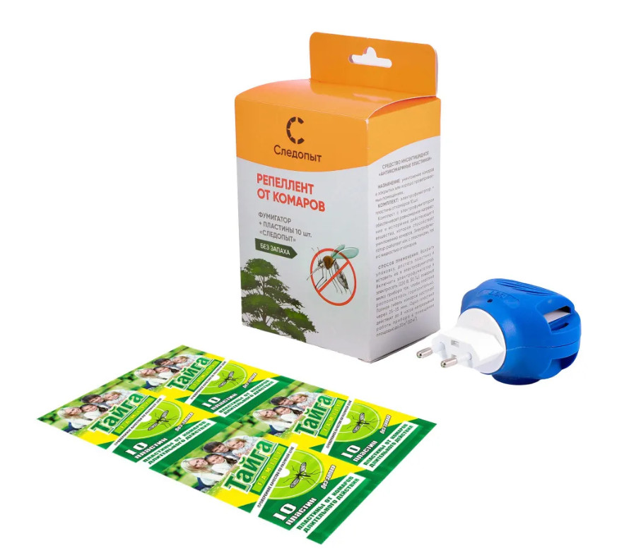 Комплект включает в себя: электрофумигатор и пластины от комаров "Следопыт", 10 шт. Средство не имеет запаха. Одна пластина действует до 8 часов непрерывной работы прибора в помещении площадью до 20 м2 (50 м3). Электрофумигатор работает как с пластинами, так и с жидкостью от комаров. Состав: трансфлутрин (4,5 мг / пластину), антиоксидант, растворитель, краситель.