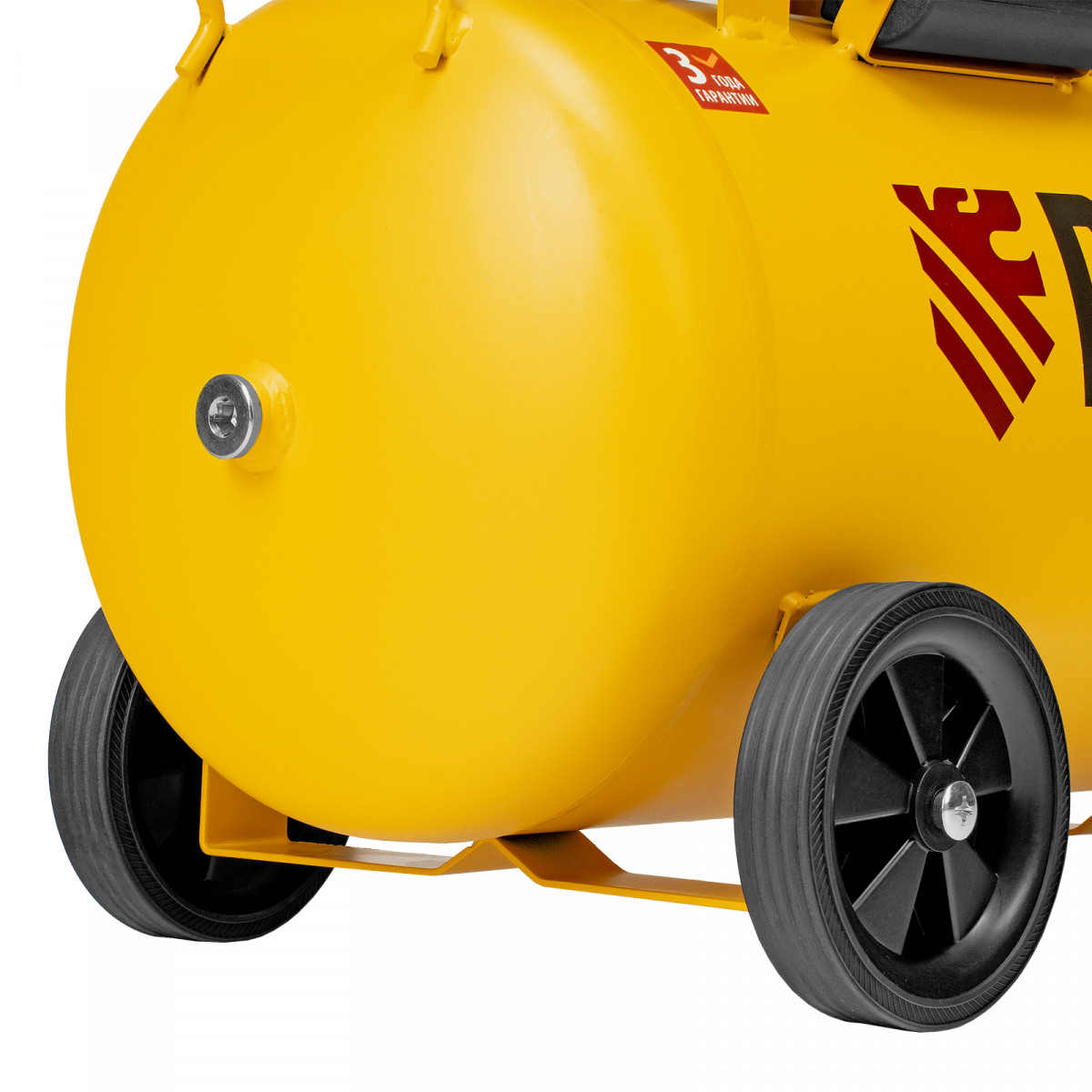- Мобильность — 2 колеса и транспортировочная рукоятка упрощают перемещение компрессора по рабочей зоне.