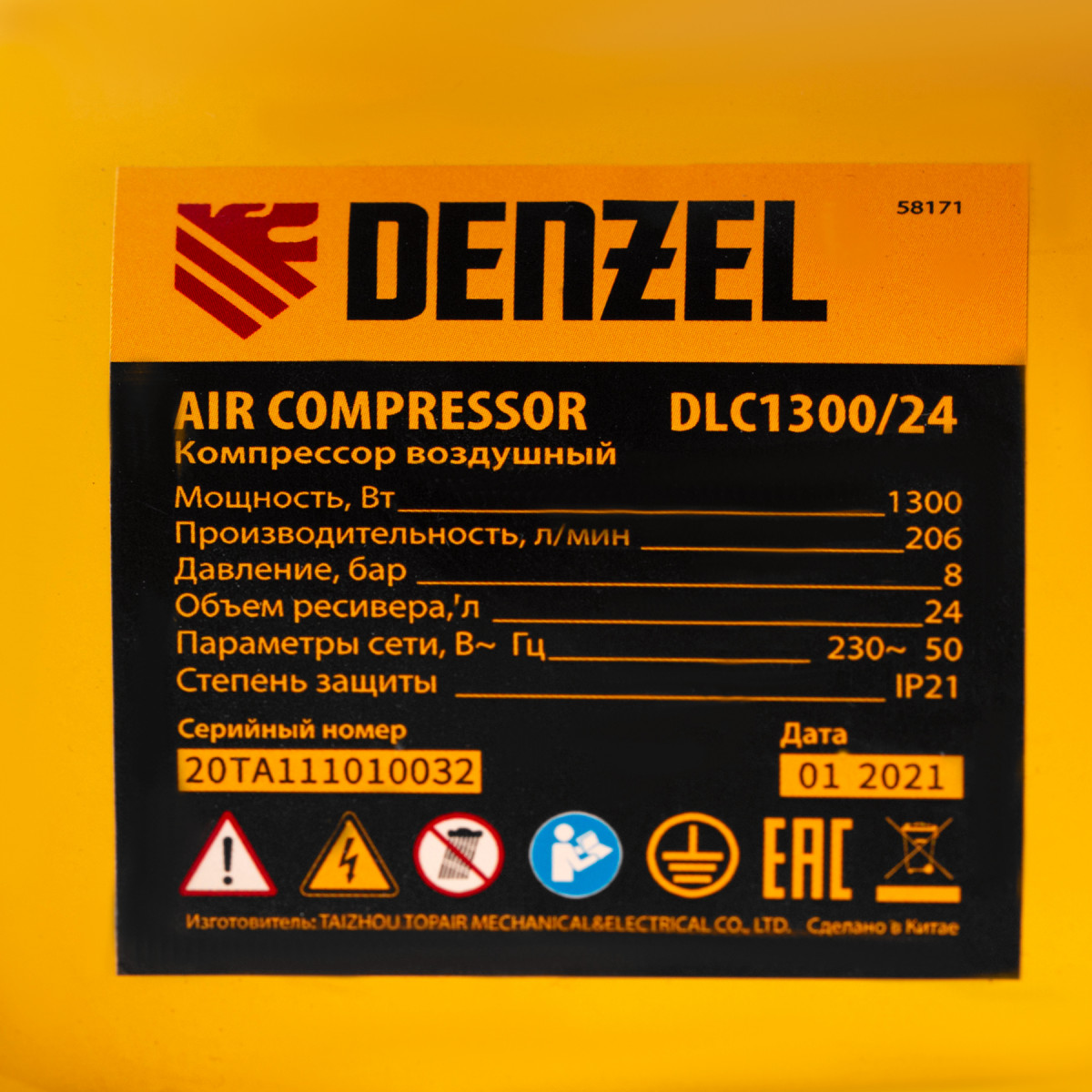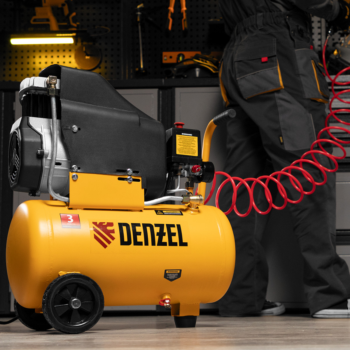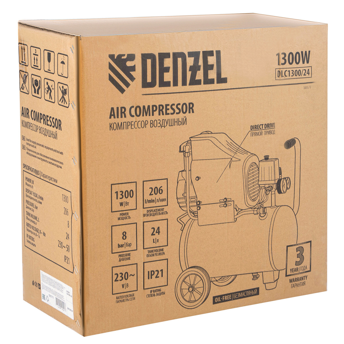 Компрессор воздушный DLC1300/24 безмасляный 1.3 кВт, 24 литра, 206 л/мин Denzel