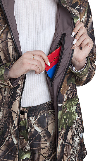 Практичный женский костюм в комуфляжной расцветке для активного отдыха на природе. Из современной трехслойной ткани ПОНЖИ. Ткань прочная и дышащая, с водоотталкивающим покрытием, быстро сохнет и обеспечивает воздухообмен. В этой куртке вы будете чувствовать себя защищенной от влаги и ветра, в любую погоду холодного демисезонья.