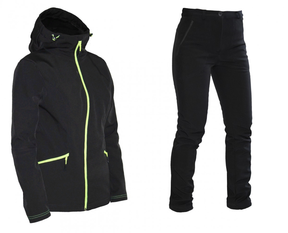 Костюм женский из мембранного материала Soft Shell анатомического кроя с контрастной отделкой салатового цвета. Изделие без подклада. Куртка: Куртка прилегающего силуэта с рельефными линиями по переду и спинке. Без плечевых швов. На передней части куртки имеются два кармана на молнии. Рукава втачные анатомического кроя. Низ куртки утягивается. Капюшон втачной с утяжкой на шляпную резинку с помощью фиксатора. Брюки: Брюки прямого силуэта с поясом и застежкой на молнию и пуговицу. По поясу имеются шлевки. Два кармана на молнии. Вытачки в области колена (анатомический крой). Материал: Soft Shell Состав: 100% пэ Плотность: 300 гр/м2 Мембрана: 8000/8000 Цвет: черный Отделка: салатовая фурнитура