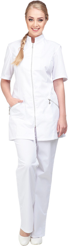 Костюм состоит из блузы и брюк. Блуза: • удлинённая модель • центральная застёжка на молнию • прорезные карманы с наклонным входом и застёжкой на тесьму - молнию • полочка с рельефами • воротник-стойка • фурнитура с серебряным блеском Брюки: • прямые по всей длине • пояс частично на эластичной ленте Цвет: белый Ткань: «Оптима» Состав: 65% п/э, 35% вискоза, пл.160 г/м