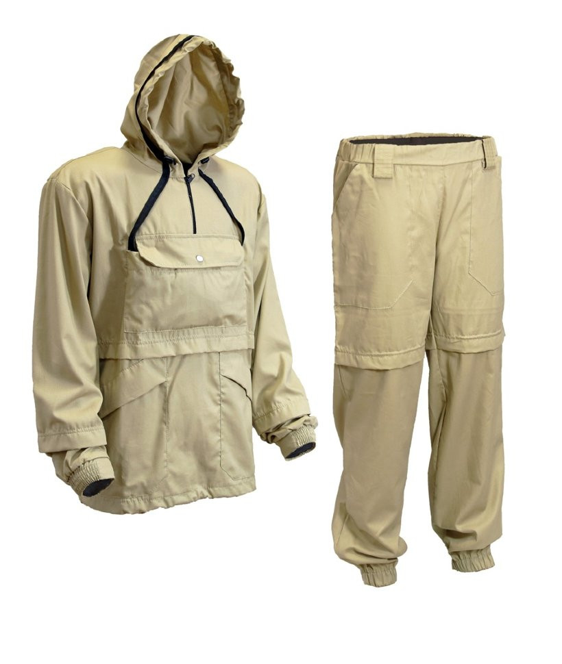Куртка антимоскитного костюма имеет форму анорака (надевается через голову). На куртке антимоскитного костюма предусмотрен один большой нагрудный накладной карман с клапаном на молнии, а также два прорезных кармана. Капюшон от куртки антимоскитного костюма имеет специальную сетку, которая полностью защищает от насекомых лицо и шею человека. Манжеты на рукавах антимоскитного костюма выполнены из трикотажной резинки и также выполняют функцию защиты от насекомых – плотно облегают руку, предотвращая попадание под антимоскитный костюм насекомых. Его возможно затянуть так, чтобы насекомые не пробрались внутрь антимоскитного костюма. Брюки антимоскитного костюма имеют простую прямую форму. На брюках антимоскитного костюма предусмотрены два прорезных кармана. Низ брюк затягивается при помощи эластичного шнура со стропами (по аналогии с низом куртки антимоскит