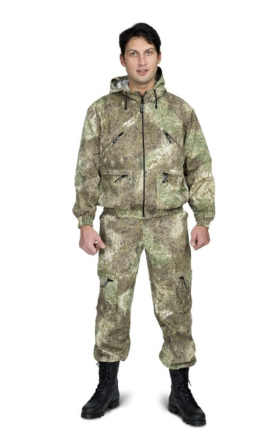 Удобный и функциональный костюм прекрасно подойдет для всех любителей активного образа жизни. Состоит из укороченной куртки с капюшоном и прямых брюк. Капюшон куртки регулируется по овалу лица. Низ куртки и рукава собраны на широкую простроченную резинку. Два нагрудных кармана и два накладных объемных кармана закрываются на молнии. Пояс брюк полностью эластичный с шлевками. Низ брюк собран на резинку. Два глубоких кармана у пояса и два вместительных объемных набедренных кармана на молниях. Смесовая ткань позволяет костюму быть практичным и удобным в эксплуатации. Костюм «Рысь» пользуется популярностью как у любителей активного отдыха, так и как надежный рабочий костюм.